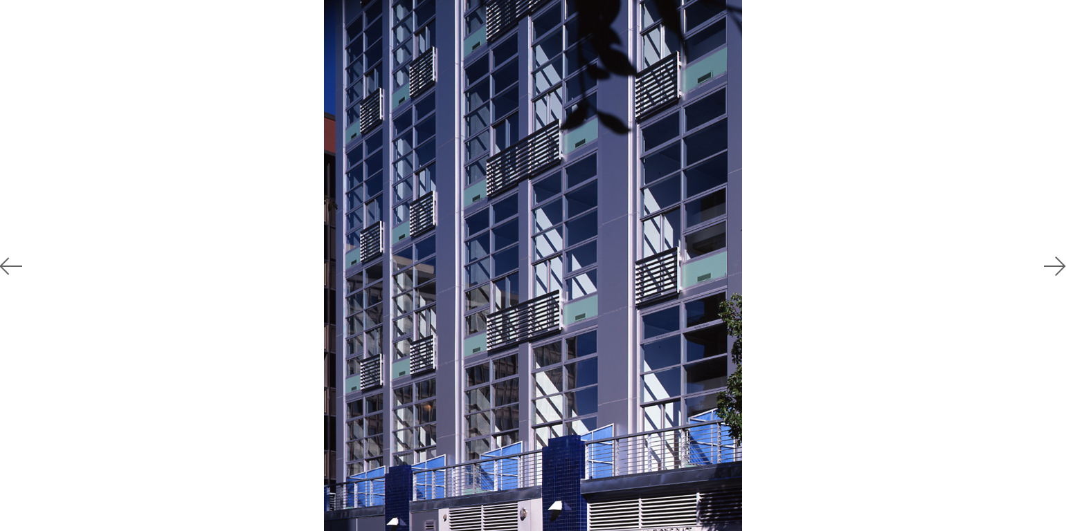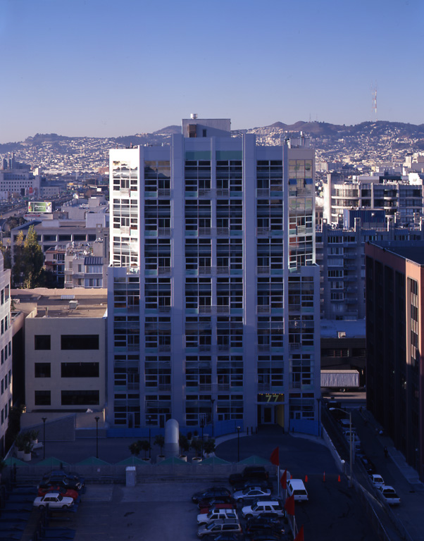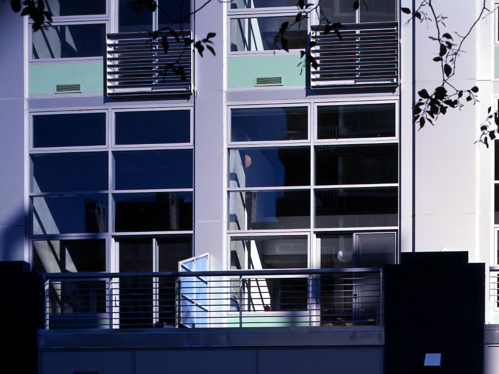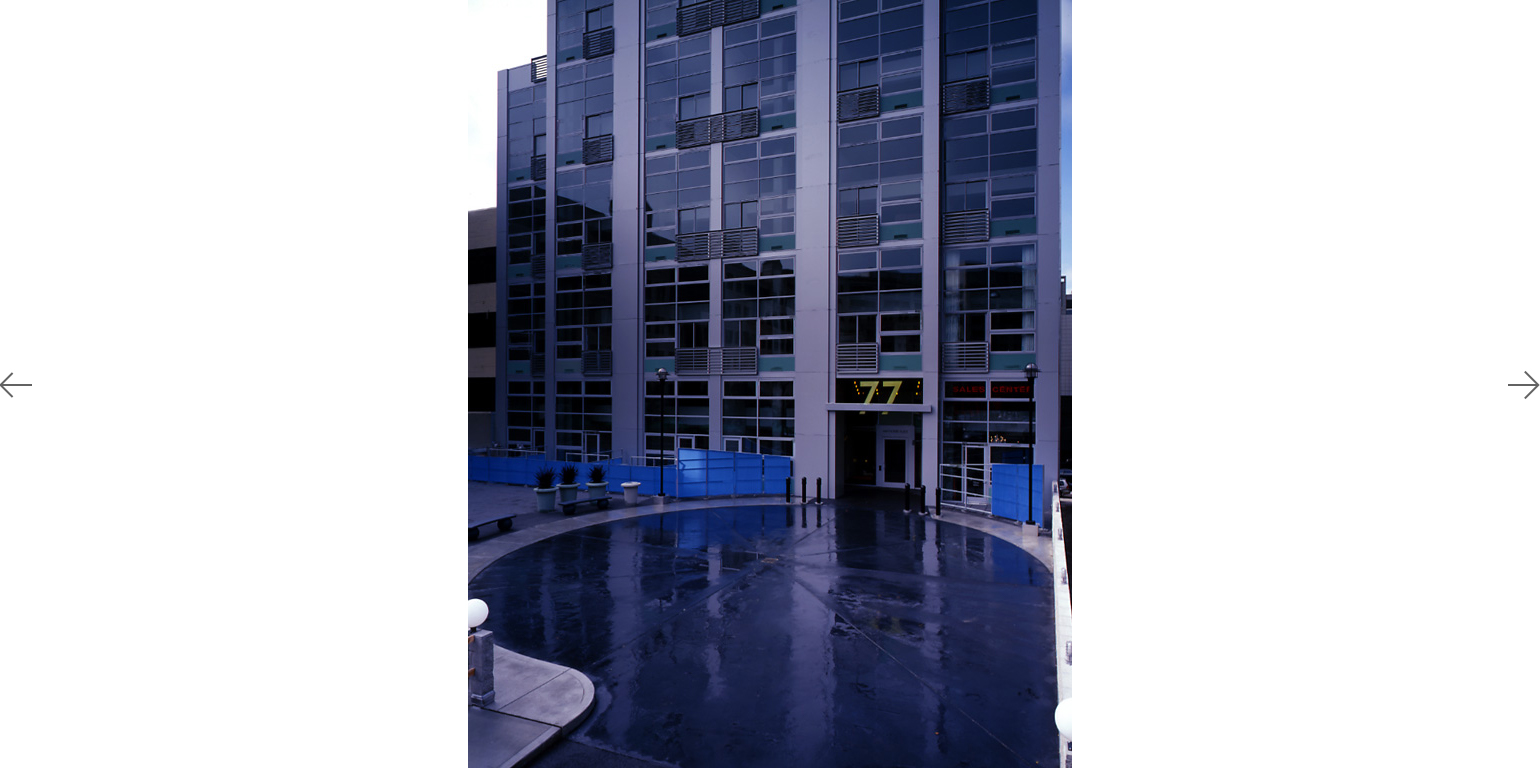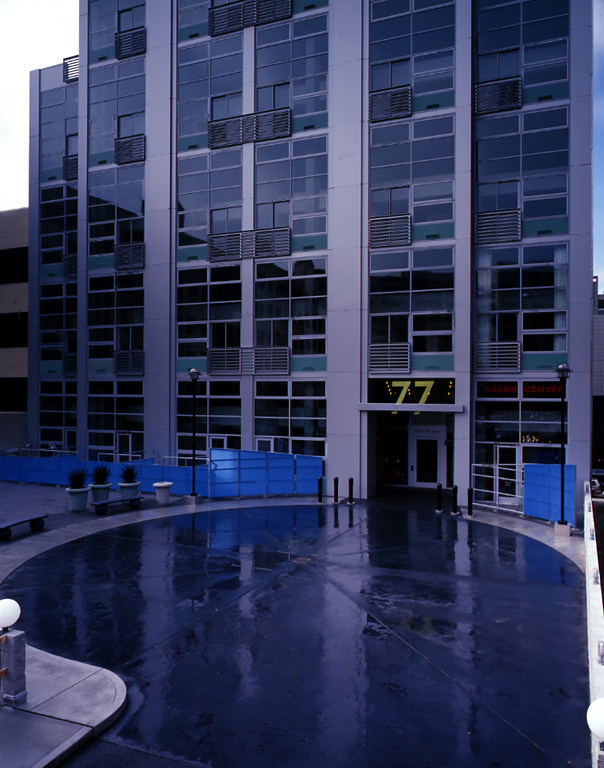 The building at 77 Dow Place is a very small skyscraper, with 83 very spacious loft-style dwellings. Each unit has a kitchen completed with cinnamon-fir cabinets and green/black granite, to add color to the stainless steel, raw concrete and pale plaster walls that compose the basic materials palette. Huge sliding doors are combined with windows in a two-story pattern, to express the nature of each unit on the building's elevations. The elevations are pure lustrous aluminum with colored accent panels in green, and with green and blue translucent dividers at grade.