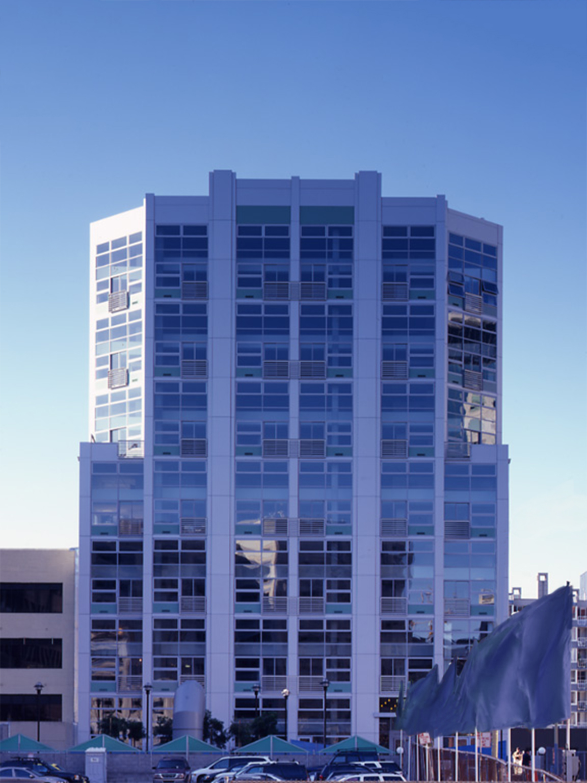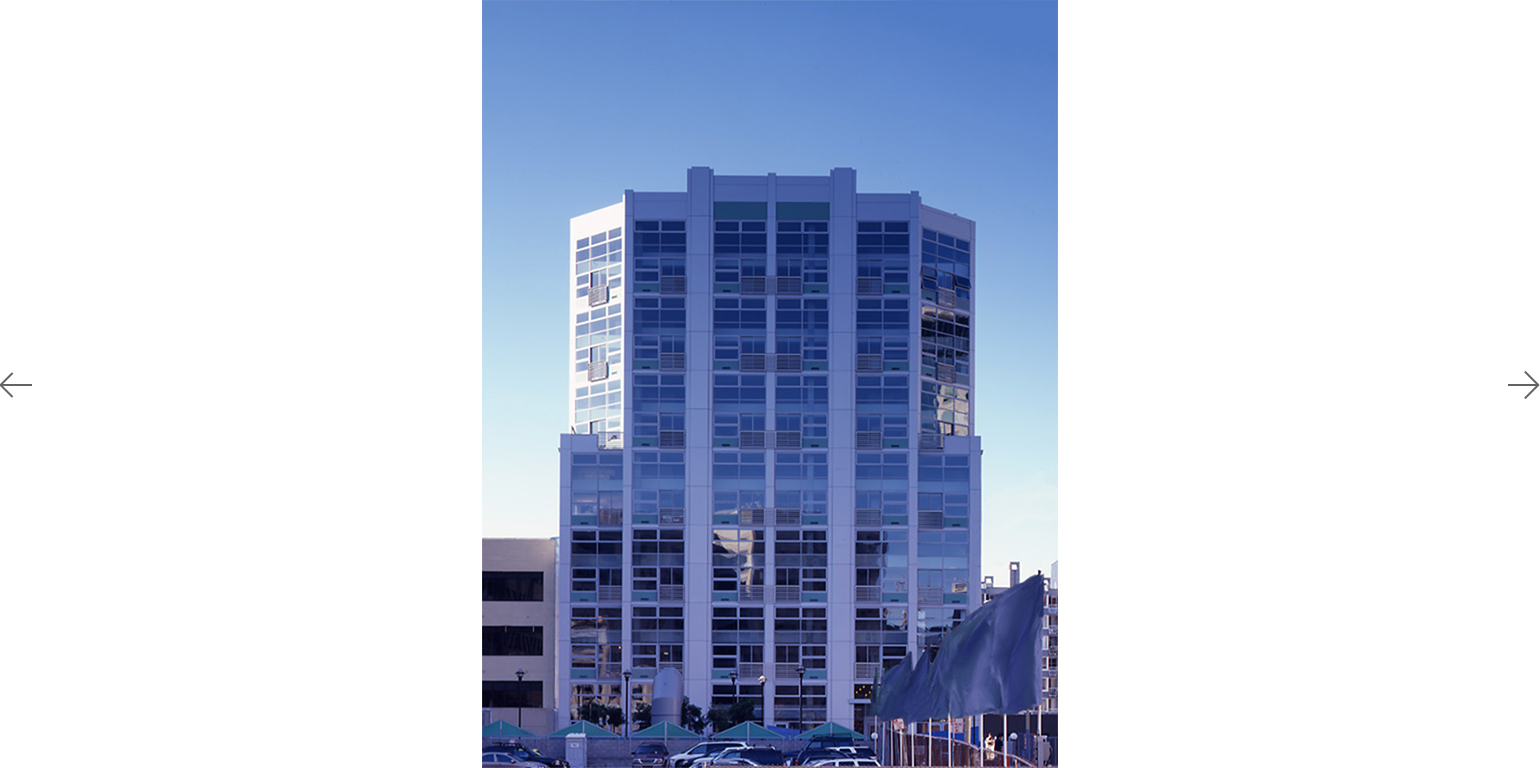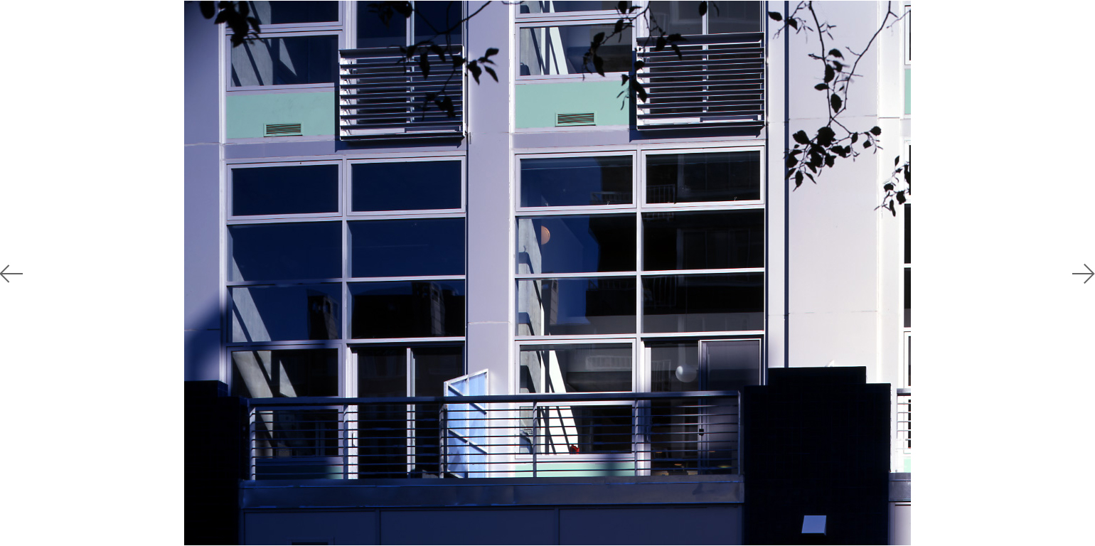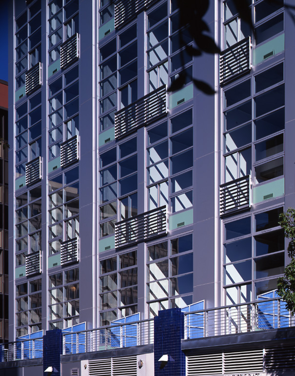 The building at 77 Dow Place is a very small skyscraper, with 83 very spacious loft-style dwellings. Each unit has a kitchen completed with cinnamon-fir cabinets and green/black granite, to add color to the stainless steel, raw concrete and pale plaster walls that compose the basic materials palette. Huge sliding doors are combined with windows in a two-story pattern, to express the nature of each unit on the building's elevations. The elevations are pure lustrous aluminum with colored accent panels in green, and with green and blue translucent dividers at grade.