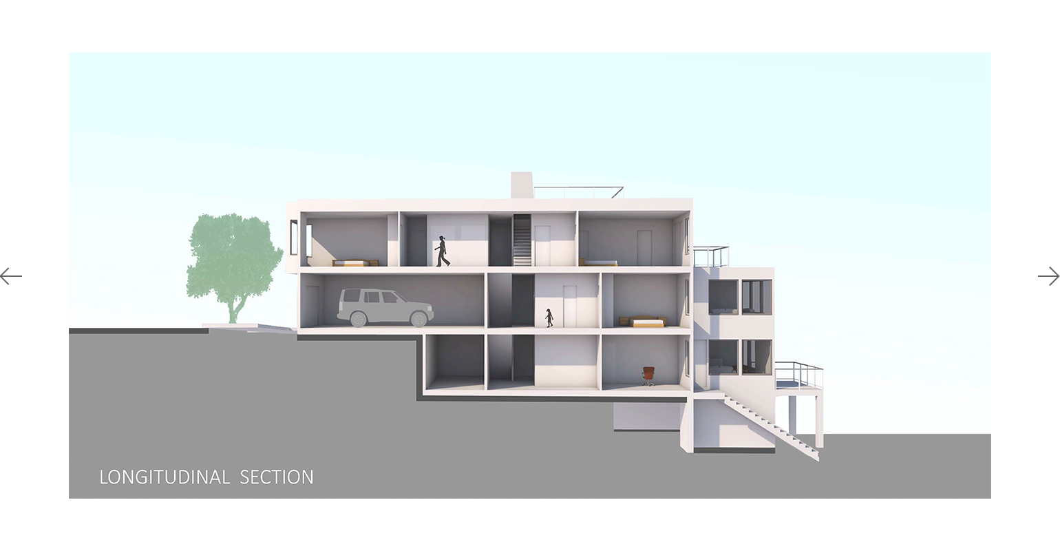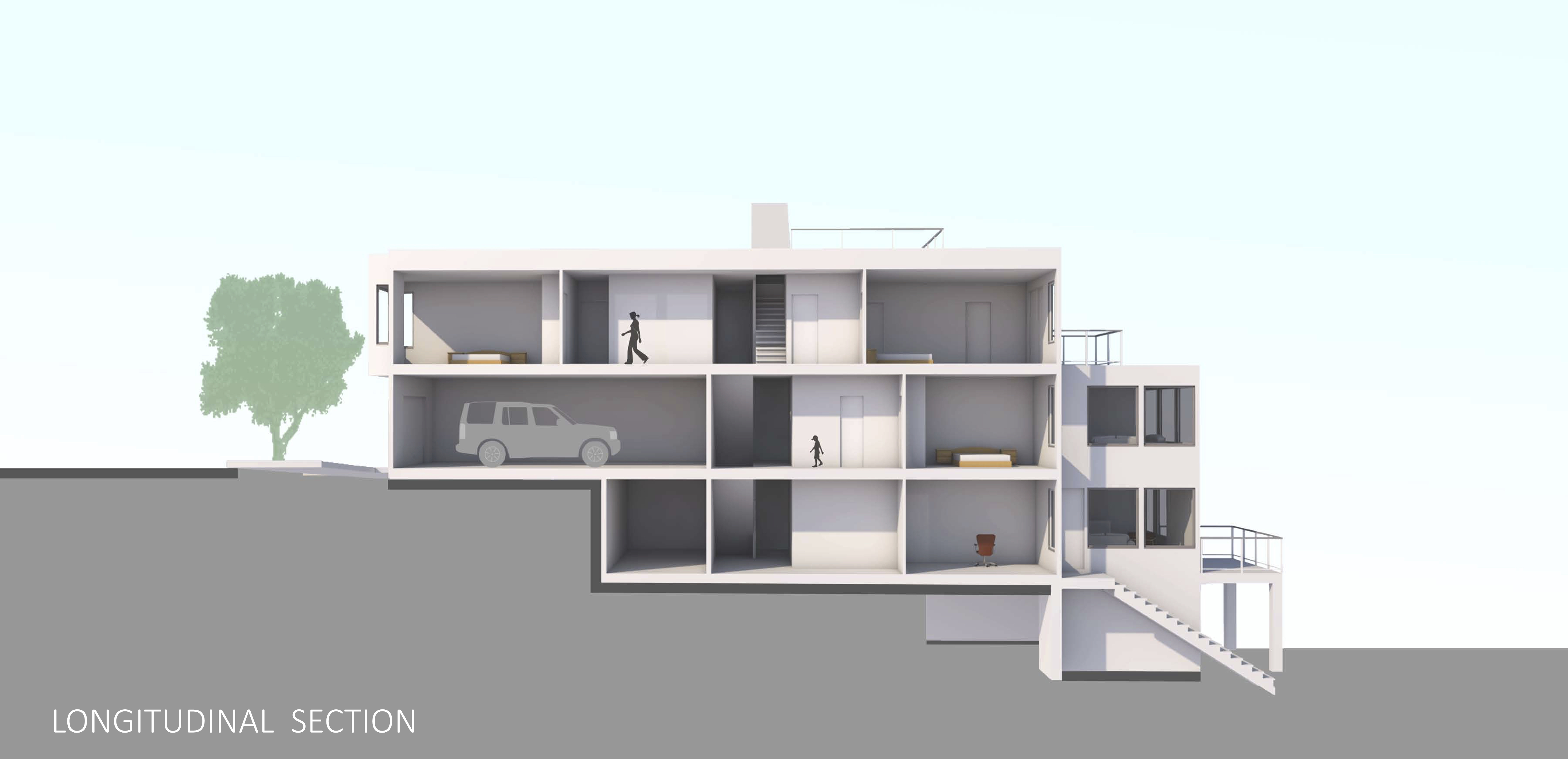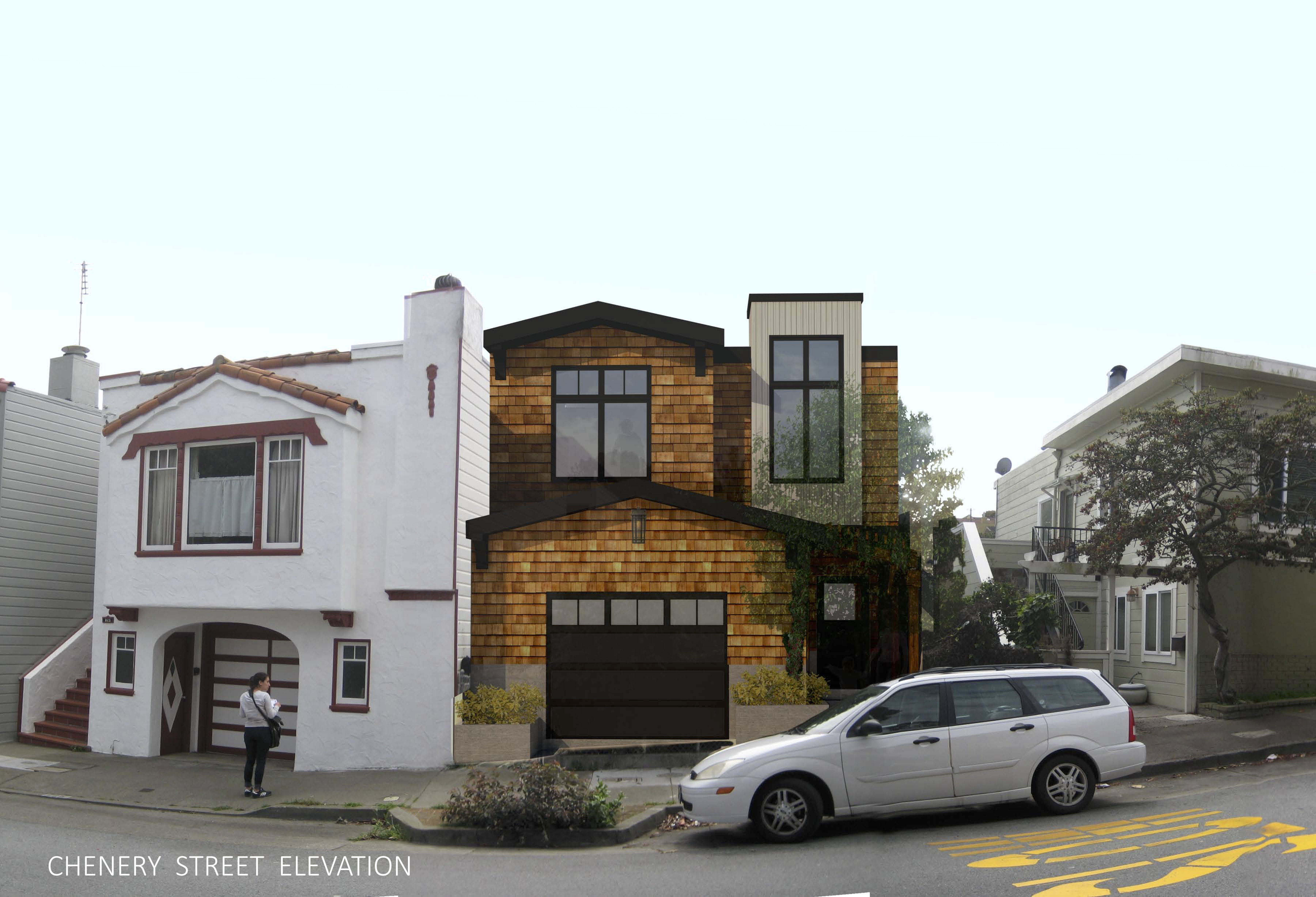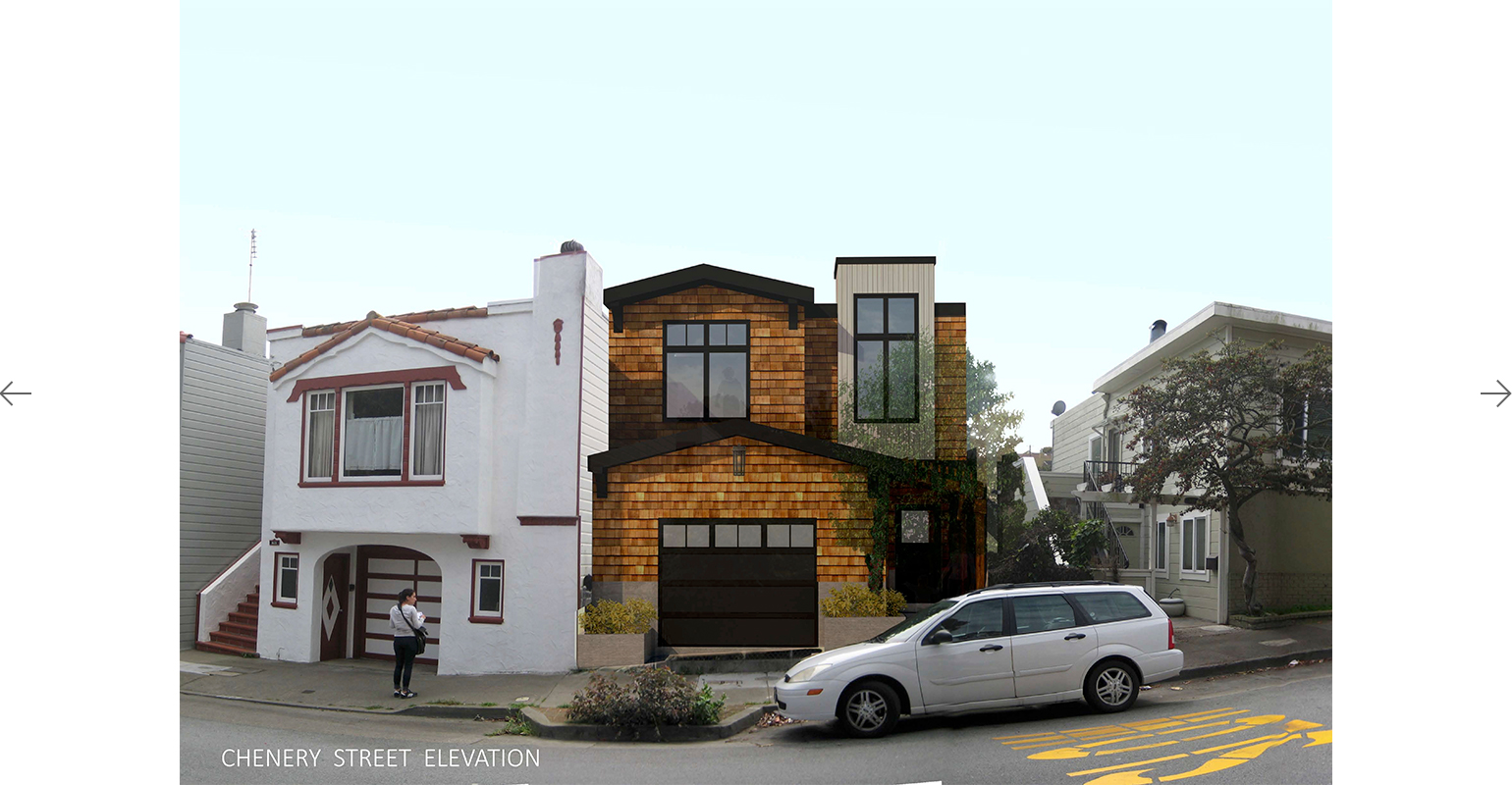 A modern interpretation of shingle style Craftsman building on a row of 40’s era cement plaster homes on a down sloping lot in San Francisco’s Glen Park neighborhood, will be home to a family of four. The four story home will have the living areas at the street level and sleeping areas above; the lower two floors include a music room for the father, a guest bedroom and entertainment room for the kids. Construction to commence spring 2017.
