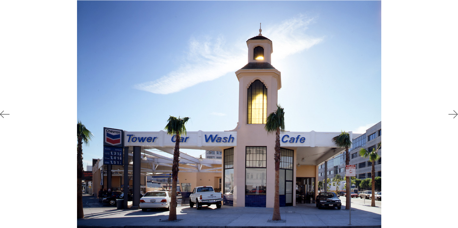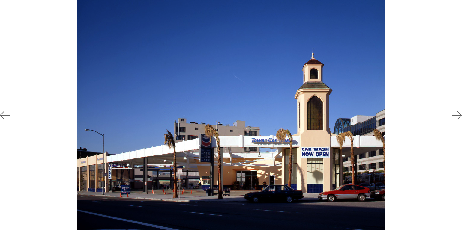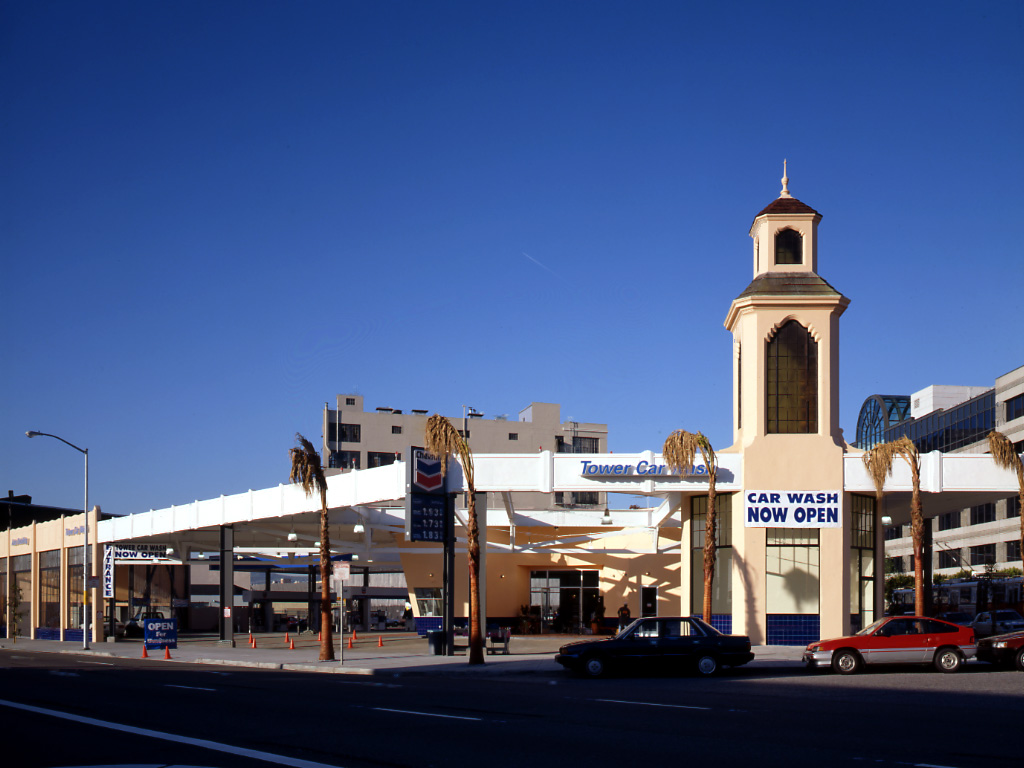 The Tower Car Wash is an adaptive reuse of a 30's Moderne/Spanish Colonial landmark, conceptually uniting old and new beneath it's great sheltering canopy. Contemporary materials were fused with an existing structure to bring an openness, light and color to the previously dark and enclosed structure. The frankly industrial character of the canopy construction became a point of departure for many details. The Mediterranean/California tower is revealed by the creation of a halo-shaped oculus, which illuminates the gleaming autos below and enshrines Californians' love affair with their cars.