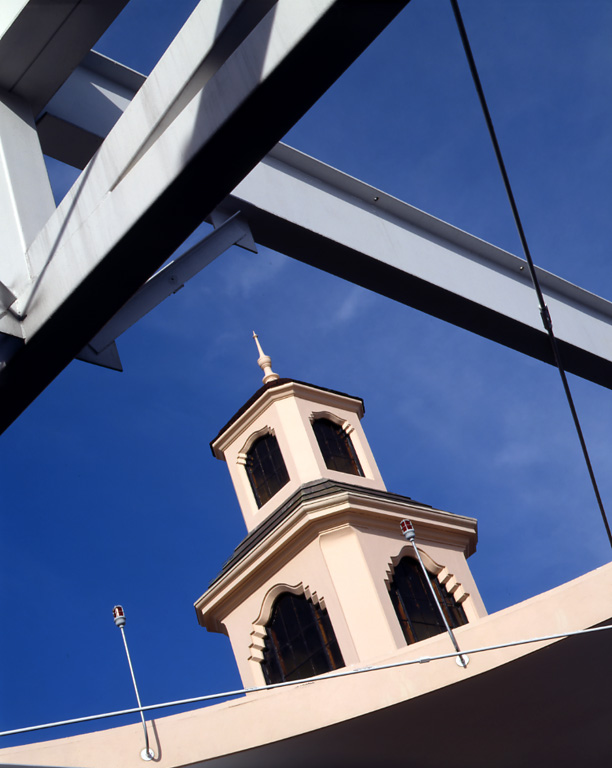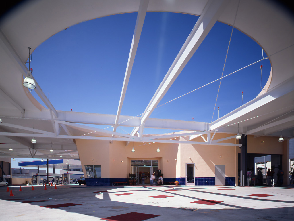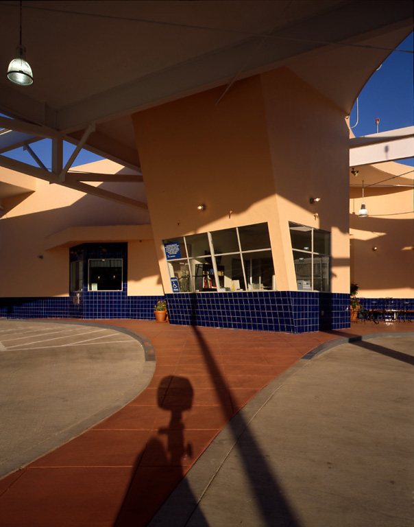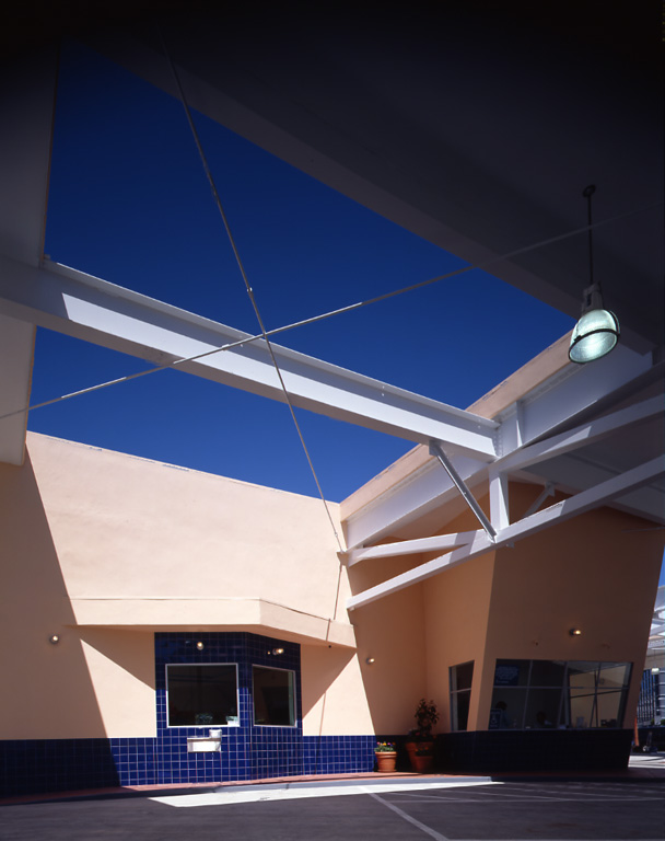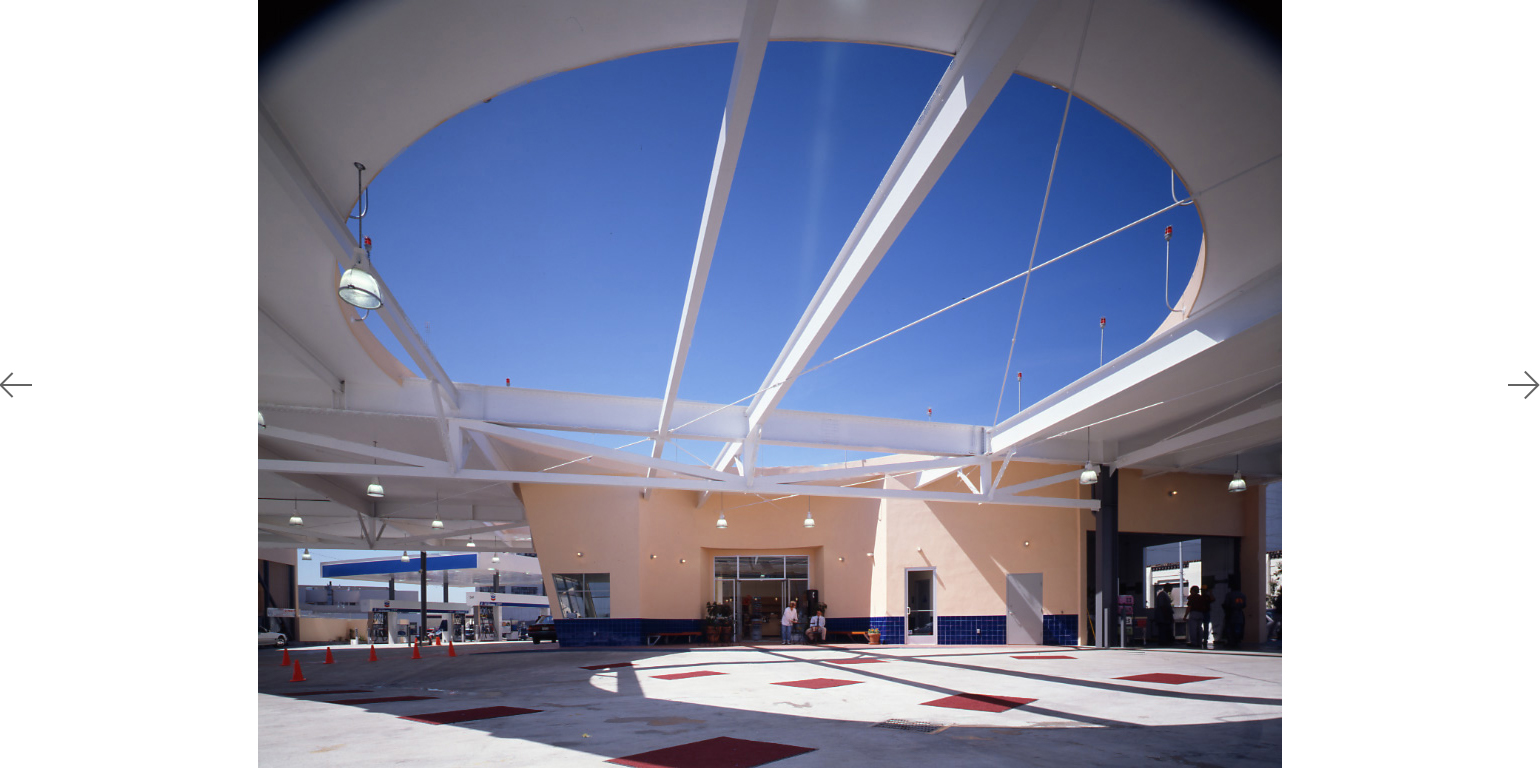 The Tower Car Wash is an adaptive reuse of a 30's Moderne/Spanish Colonial landmark, conceptually uniting old and new beneath it's great sheltering canopy. Contemporary materials were fused with an existing structure to bring an openness, light and color to the previously dark and enclosed structure. The frankly industrial character of the canopy construction became a point of departure for many details. The Mediterranean/California tower is revealed by the creation of a halo-shaped oculus, which illuminates the gleaming autos below and enshrines Californians' love affair with their cars.